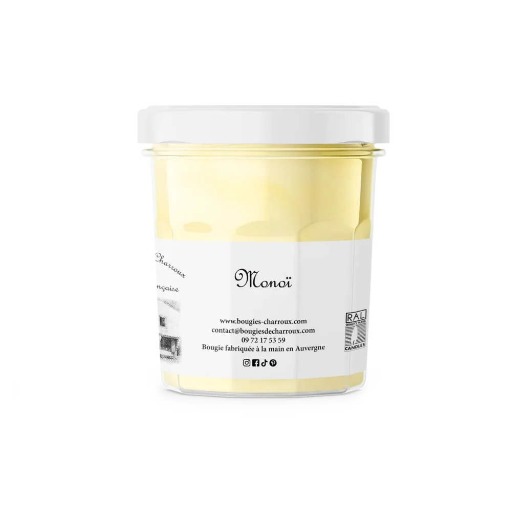 La bougie parfumée Monoï Les Bougies de Charroux est notre best-seller depuis des années et des années ! Elle masque toutes les odeurs, pour une maison saine au parfum fruité. Grâce à sa parfaite senteur de monoï, ce mélange de fleur de tiare et d’huile de coco embaumera toutes les pièces de la maison sans difficulté. Aucune mauvaise odeur ne lui résiste !
